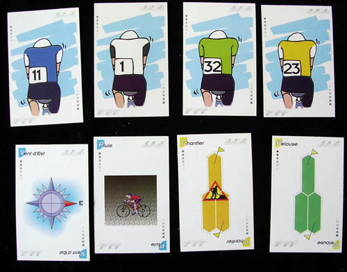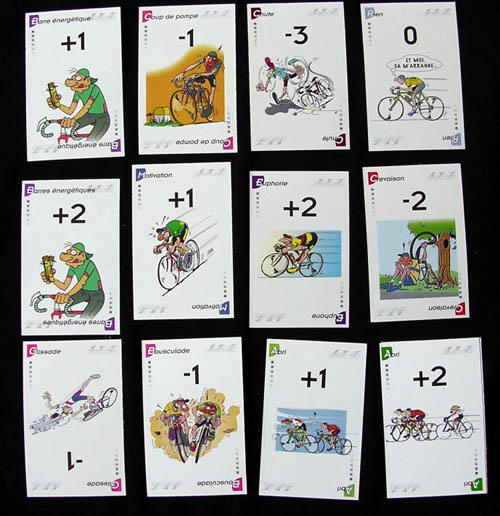 Yet another 90's French game. This one offers a reversible board. On the colored side there is a road circuit, on the black and white side we find a track. The game includes 15 big plastic cyclists and 280 cards. According to the designer, this game (subtitled "Le jeu de stratégie du cyclisme") is recommended by the Fédération Française de Cyclisme. We wouldn't recommend it so much, at least from the strategical point of view. Although it is ambitious, in the sense that it tries to reproduce all the circomstances of a real cycling race (including weather!), in the end it turns out to be just another chance game. Nevertheless, if you are not looking for a deeply strategical game and you just want to have some fun, you can try this one.
