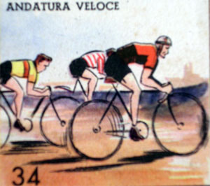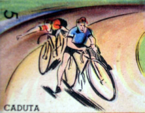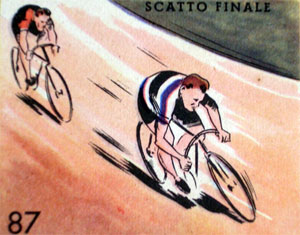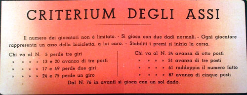 An old italian board. Very simple game with nice graphics. It is named after the "Criterium des As", which was a race held at a circuit at Longchamp near Paris at the end of the season to which only the best riders of the season were invited. This board measures 35 x 50 cms.