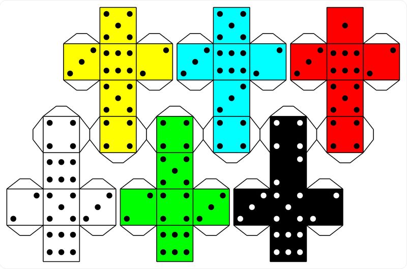 If you do not feel like printing and cutting up the dice, you can always buy blank dice (every games developer keeps a handful of those just in case) or just modify regular D6 dice with stickers,