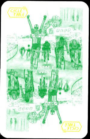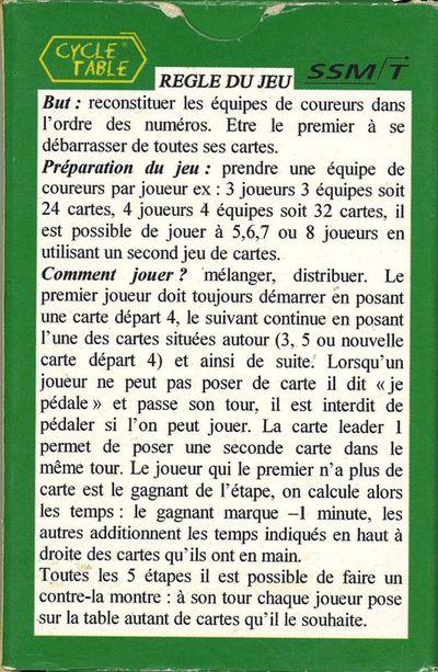 This is a cycling-themed card game produced in Saint Quentin en Mauges, France in (or around) 2004 by "SSM/T". It is a shedding-type game, one in which the player's objective is to empty one's hand of all cards before all other players.