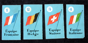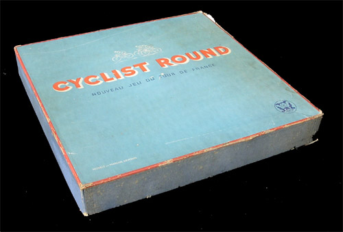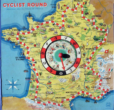 Beautiful post-war game. Strangely enough, the name of the game is English (though the game is French, and the game is subtitled "Nouveau jeu du Tour de France"). The rules are very simple. I took the photos from Geert Lagrou's copy.