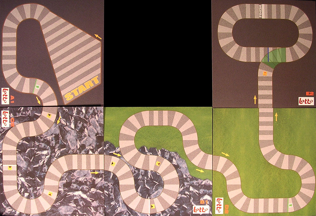 This is a game with a long story (part of which is explained in the MAKING CYCLING GAMES section). The game originated in the 1960s in the Donvil family, was further developed by Dirk Donvil, and was finally published as a promotional item for Daikin (red box) in 1999 and for Lotto (blue box) in 2002.