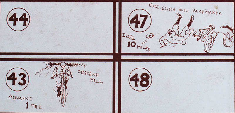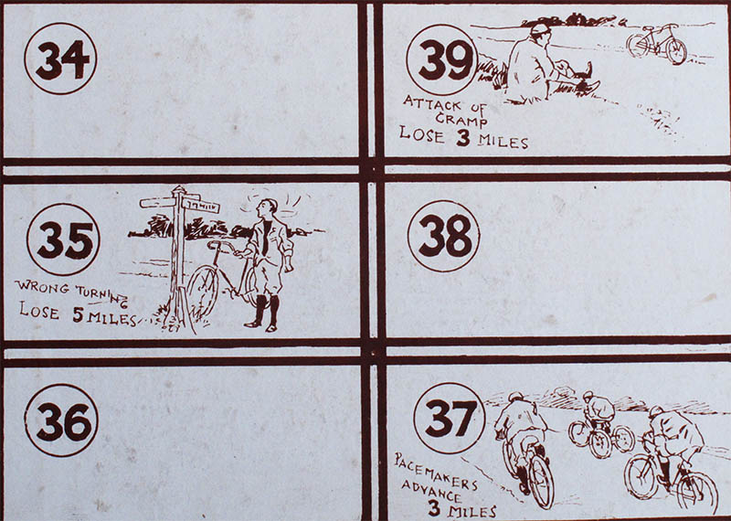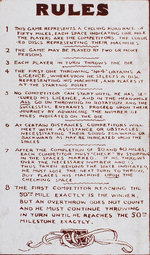 Before starting the race, the players must "obtain a license" by throwing a 4. Although the game is of course based on the game of goose, this particular rule is reminiscent of Ludo (or Parcheesi), which was introduced in England at the end of the XIXth century. (Not that this helps particularly for dating the game, since it just confirms what was already obvious).