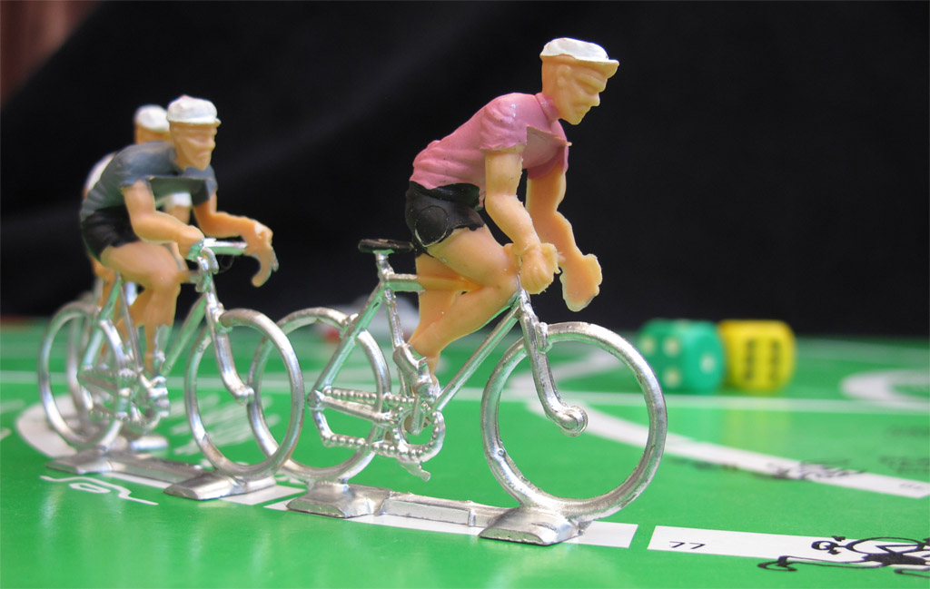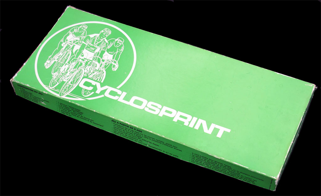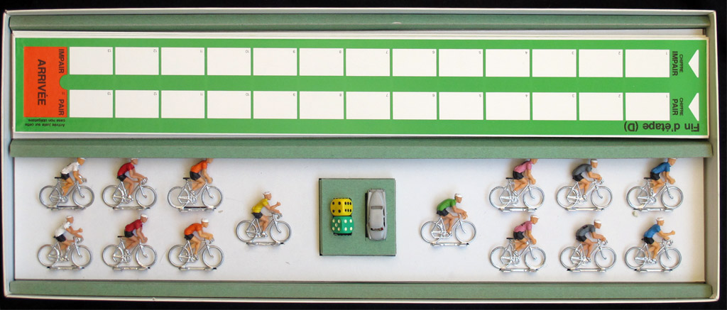 A maximum of six players manages a team of two riders each. The riders are seventies' Cofalus (5cms, smaller than the ones featured in later games like l'Echappée Infernale or Les Géants de la Route), and two extra riders are provided for the yellow and green jerseys. The riders are oversizer for the board (which is nevertheless quite big), and there is also a trailing car (voiture balai) which is an Aronde (scale HO), though I an not 100% sure if it is the original car included with the game (every time I see a copy of this game it has a different car).
