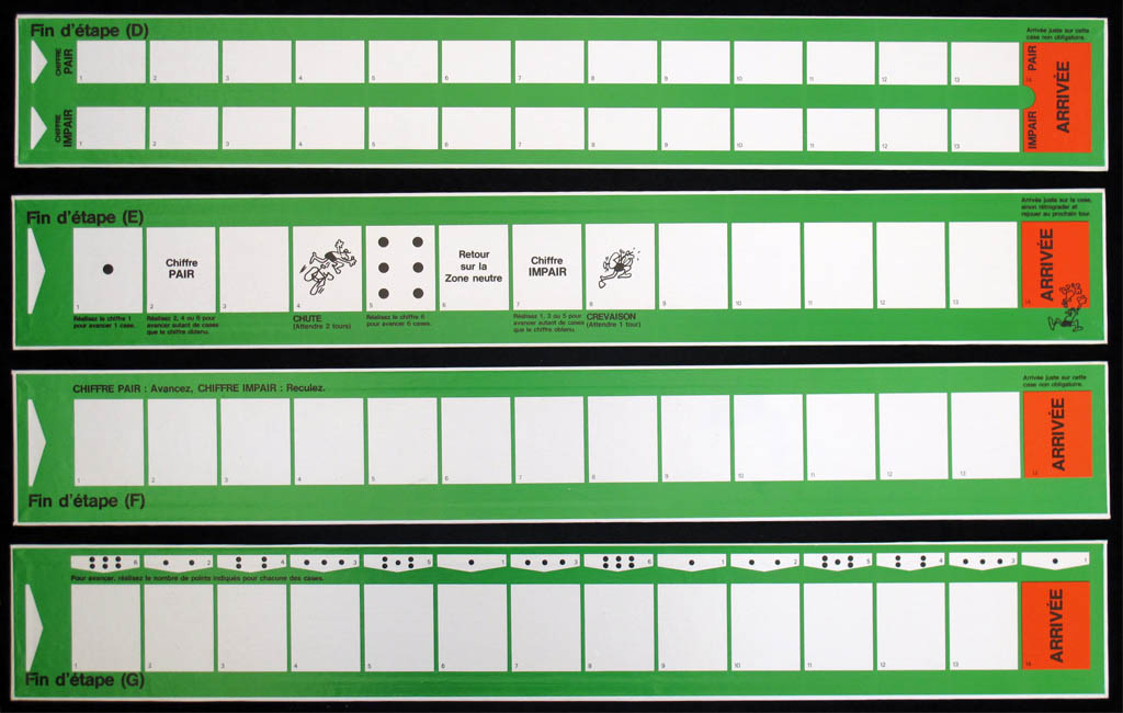 This game is big (the box measures 65 x 28 cms) and heavy, specially due to the seven (!) boards included. Five of these boards are just different finishes for various stages. Another board ("parcour montagne") can be either the end of a stage or a stage in itself, while the bigger board "("parcours plaine") is the one used in mosts races.