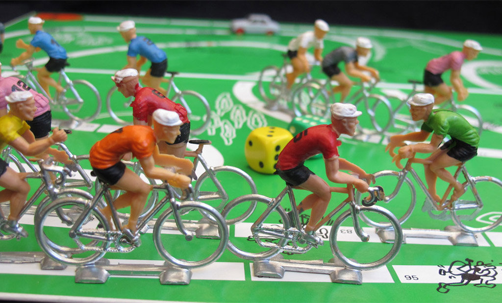 An interesting/unusual rule, though, is the one for the trailing car. It starts its movement when the first rider reachs km. 47, and stops at km 100 of flat stages. If there are two or three players in the game, the trailing car moves 5 fields forward in each movement. For 4 or 5 players it just moves 4 field. With 6 players, it just moves 3 fields. All the riders caught up by the car are out of the race, though they may take part in subsequent stages.