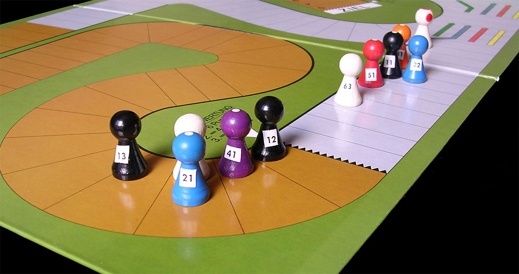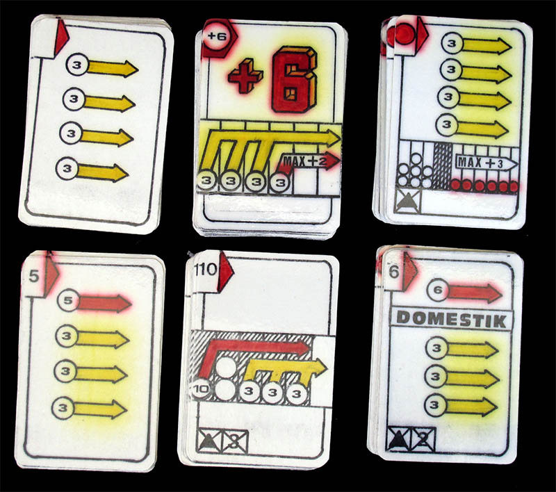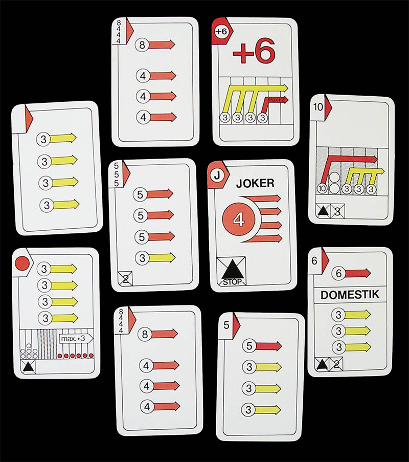 The movement of the riders is controlled by cards. There are 10 different types of cards (99 cards in total), which are quite self-explanatory. There is a 12-page booklet with the (German) rules, plus a sheet with advanced rules, as well as some score sheets.