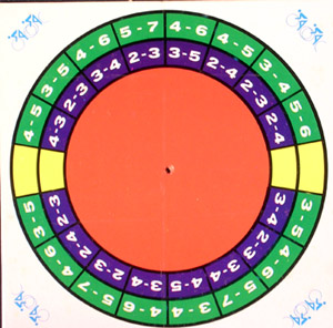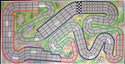 This game has a spinner instead of dice: The green area (to be used on the green-rimmed part of the track) is for descent, the blue area is for flat land and the red area is for uphill riding (in this case the speed is fixed to three squares).
