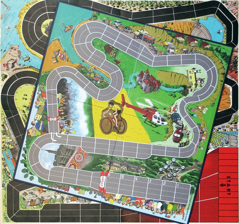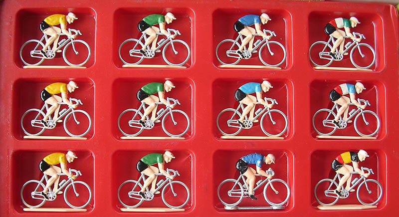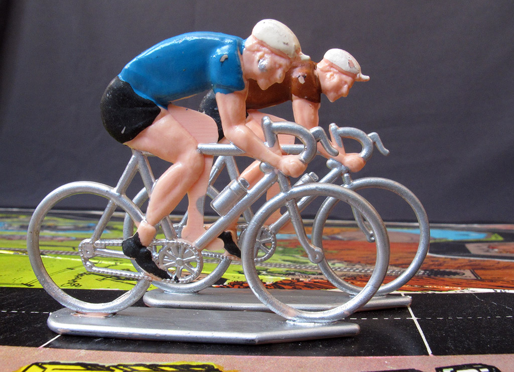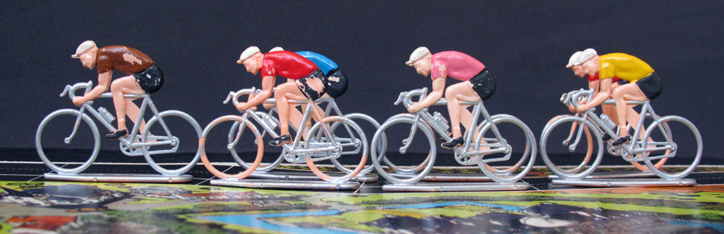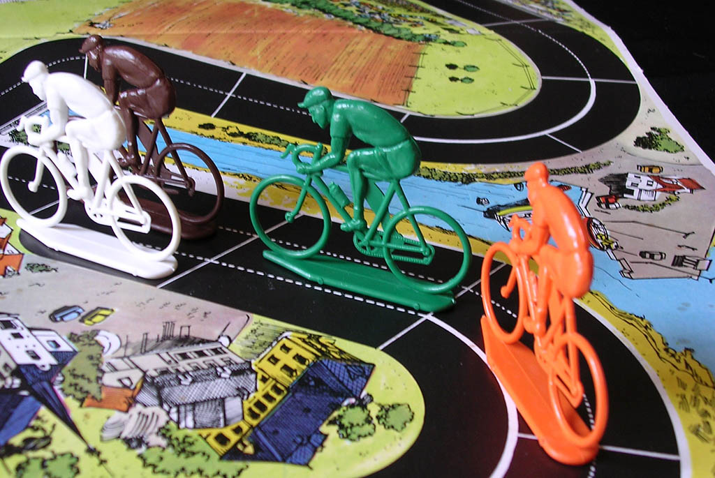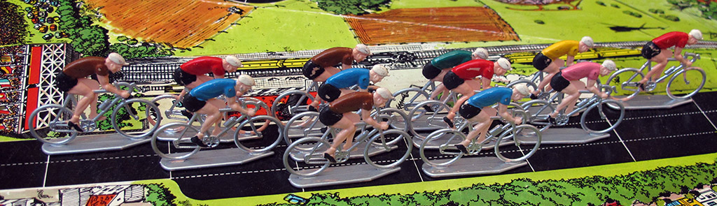 The writer of the rules is not exactly modest: "vous avez devant vous un des jeux les plus passionants du siècle". I would not say that much, but I have always liked this game. It is a good example of a simple game which nevertheless features "cycling" rules: a rule for mountain passes, a handicap for breakaway riders, and it is one of the first games to have an aspiration rule. In this case, you may draw from the rider in front of you if you like his throw of the dice. (To prevent the possible boredom of the peloton just making a translation movement everytime the leader throws a high number, the road gets narrower every once in a while, and a rider may only draft from another rider in the same lane. Some lanes get blocked sometimes, but the shape of the peloton keeps changing in a quite natural way).