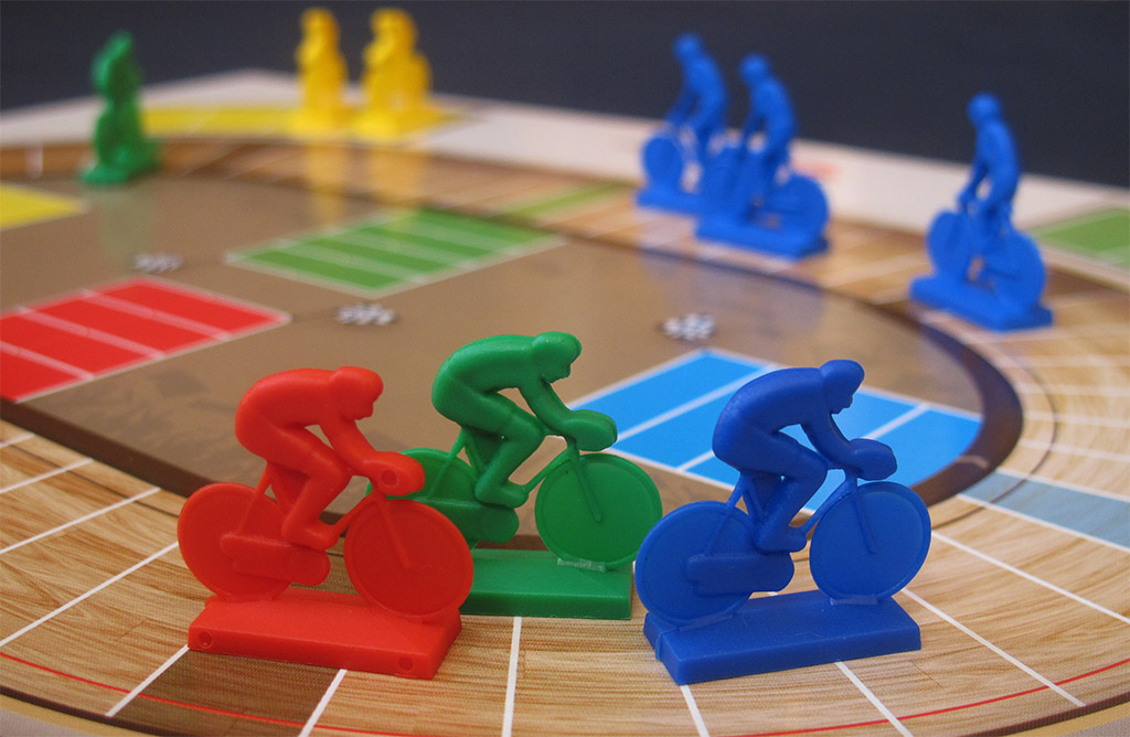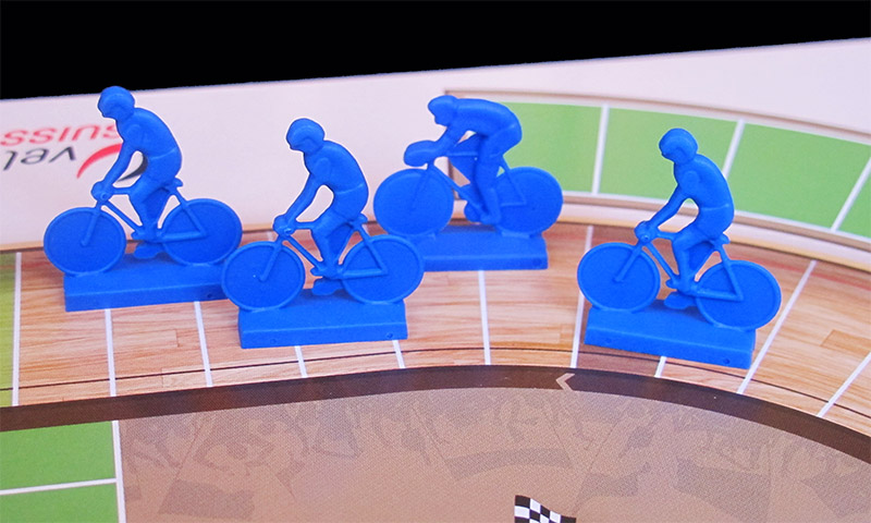 The riders included in the game are the usual type (usual in modern non-expensive games, I mean). However, at least in my copy of the game, the blue team (and only the blue team) has three inusual riders in a different position. There was probably some kind of supply problem at the moment the game was made (I think blue riders were not available either when I made my own Maillot Arc-En-Ciel game).