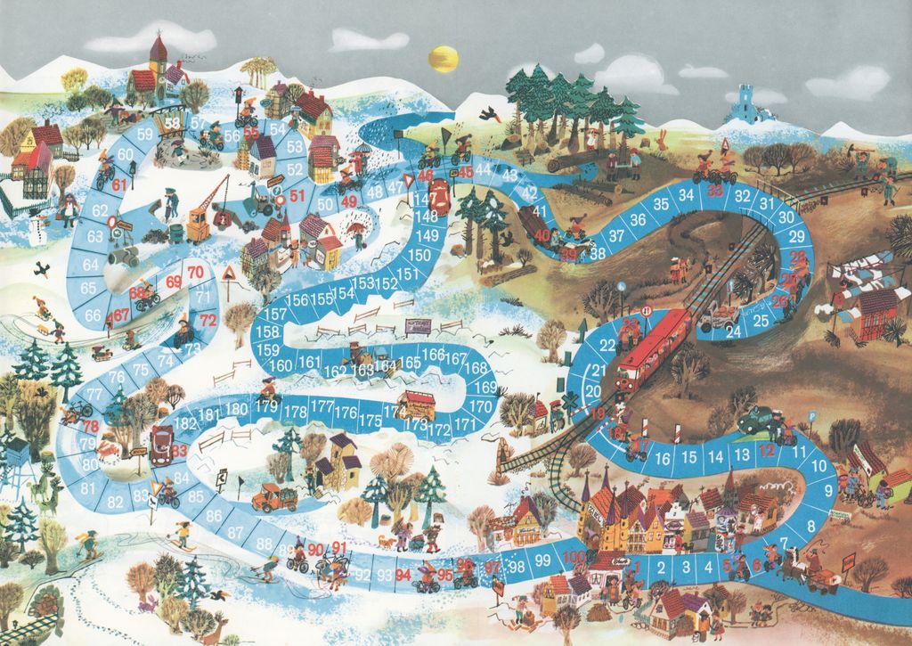 The game represents a bicycle ride through a winter landscape. The playing board measures 42x29 cm