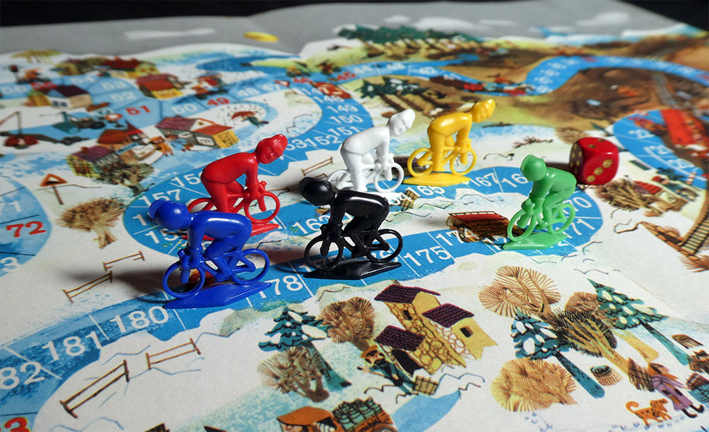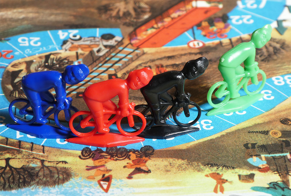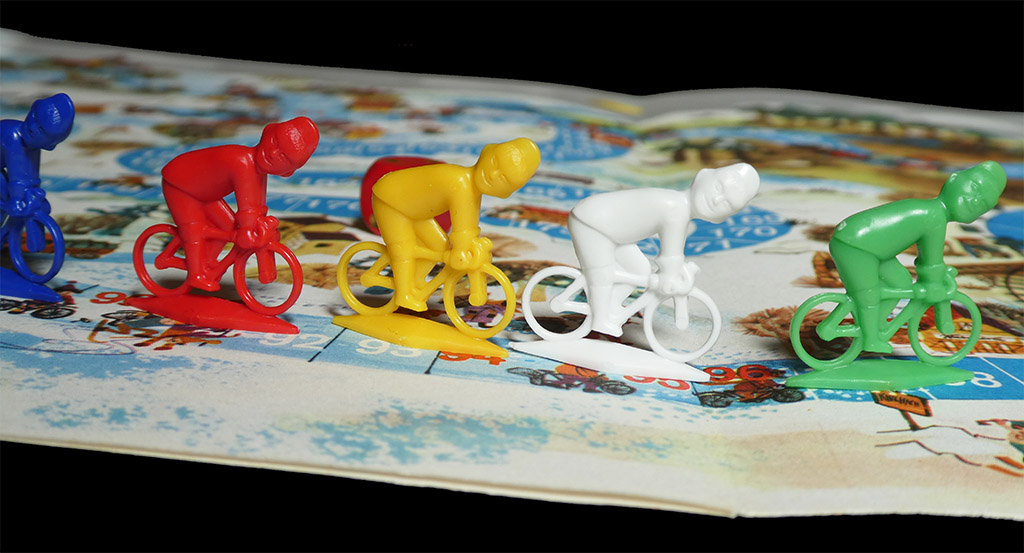 This game was issued as a promotion for the Fichtel & Sachs Torpedo three-speed derailleur. I do not know much about these things, but it looks like this piece of gear, or at least some version of it, is still in production.The game consists of a three-fold A4-sized sheet, two sides of which have the game board while the third has the rules (see below). Along with the game came a small bag with six cute little plastic cyclists and a small (10 mm) wooden die. It is legitimate to wonder whether these implements were part of the original game or if they were added by some previous owner, but most copies of the game I have seen (not that many, really) have the same cyclists and die, so we can safely assume they were part of the game.