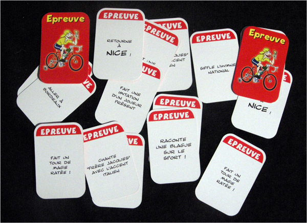 In case of landing on a red field, you draw one of those cards and follow the instructions. A few of the cards have instructions related to the game like "Back to Nice" or "Go to Bordeaux", but most of them have absurdities like "Whistle the national anthem", "Imitate another player", and so on. Probably fun after the third pastis anyway.