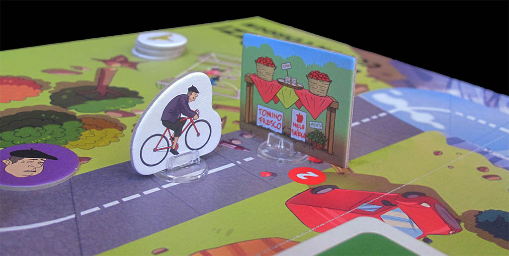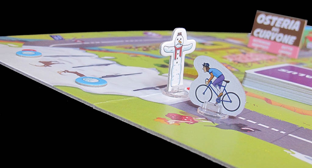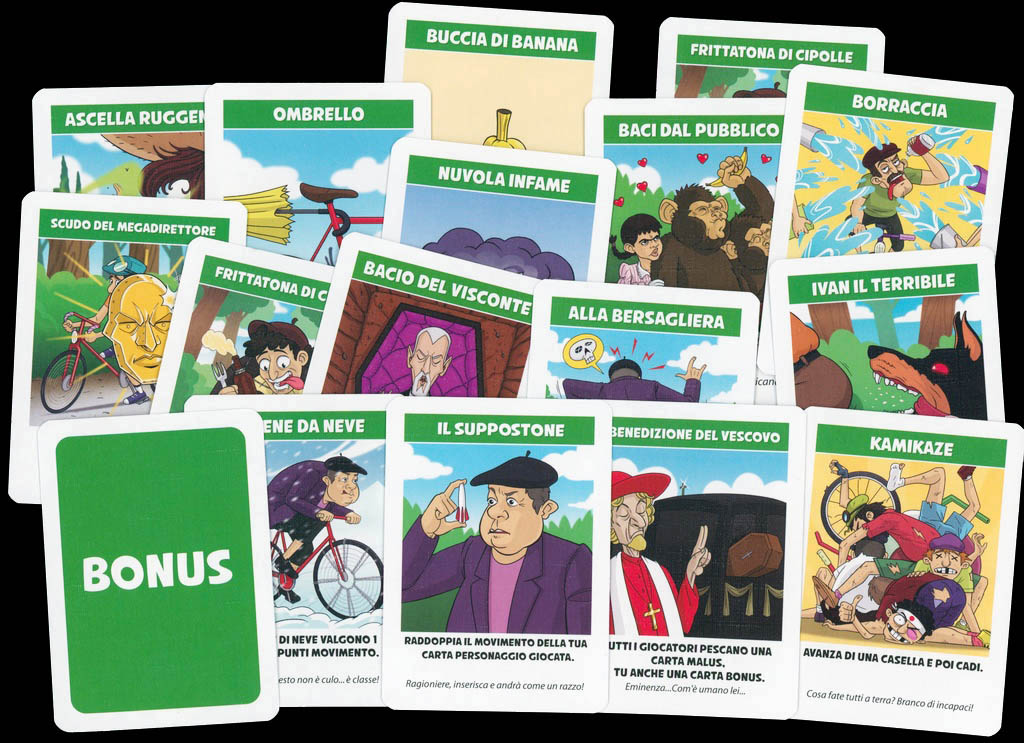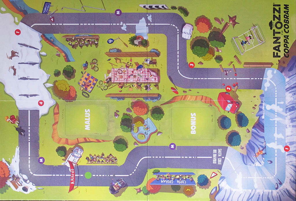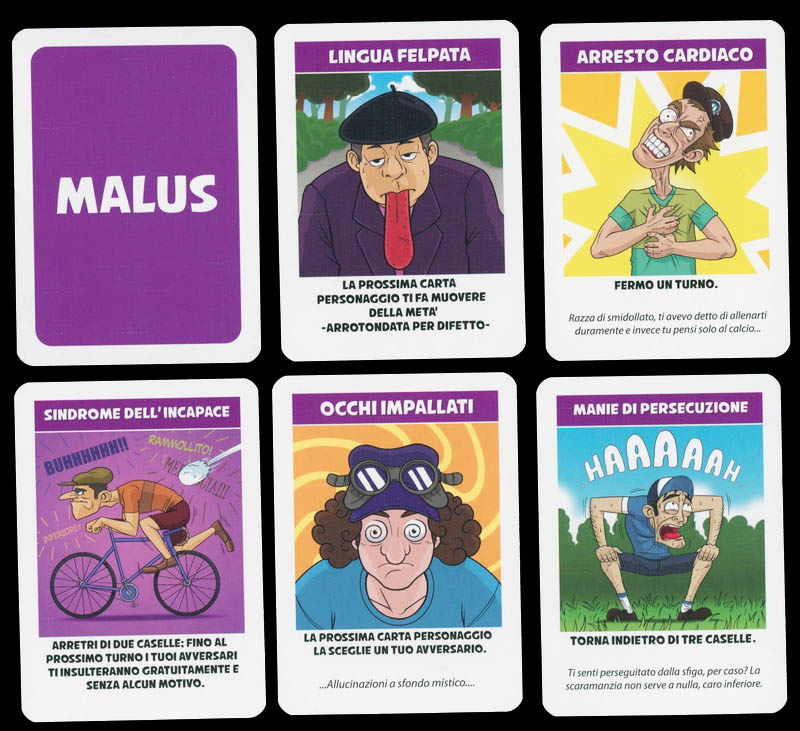 Quoting from the publisher: "COPPA COBRAM is a crazy cycling race in which players will have to do all kinds of mischief to win. In the course there are several obstacles to overcome, a deck of bonus cards to damage the opponents or benefit themselves and finally a deck of malus cards that represents penalties that players will have to fish at certain points of the course".