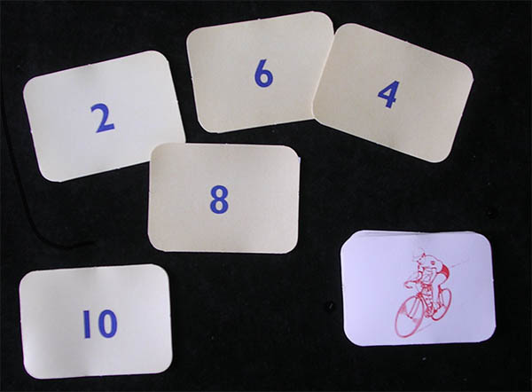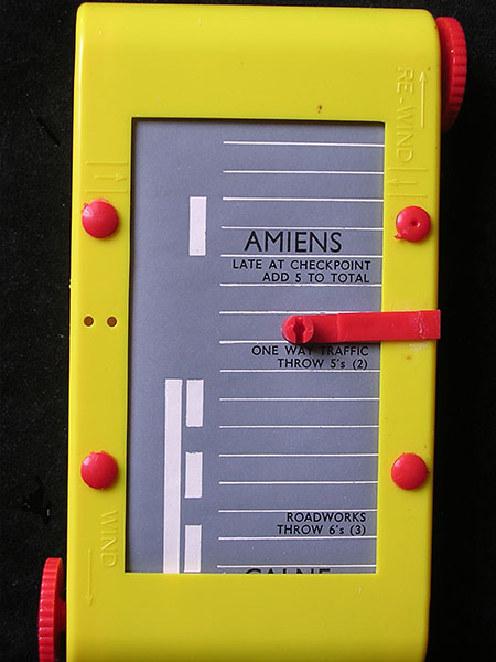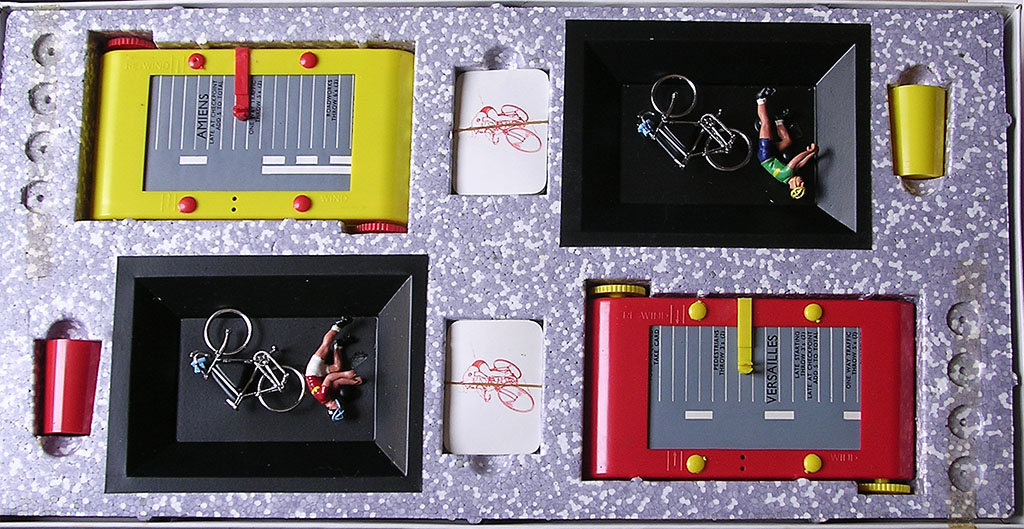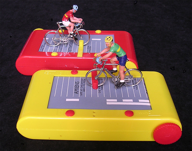 A real curiosity. In this game the board is replaced by two rolled paper bands in a plastic mechanism on which you place the riders. After the throw of the dice, you don't count squares but wind the mechanism instead.