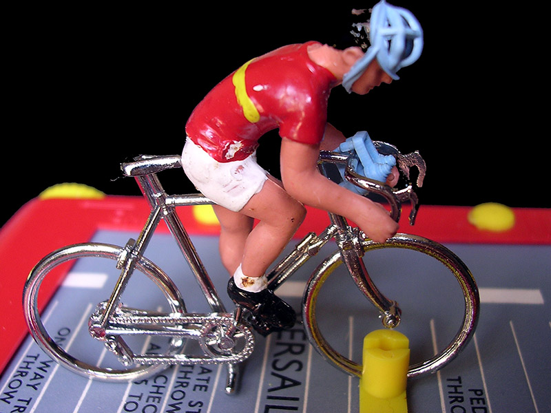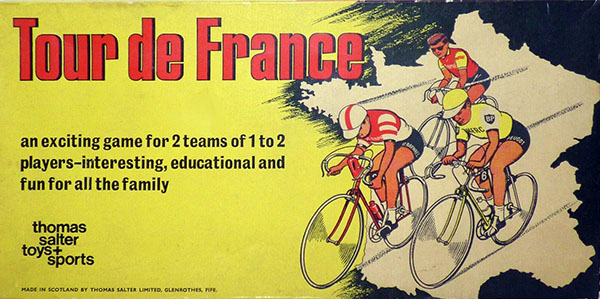 UPDATE 2025: Siegfried L. has spotted at least five different versions of this game based on car rallies. There are two Rallye Monte-Carlo versions of the game (you can see them here (1st edition) and here (2nd edition). And then there is an East African Safari version and at least two London-Brighton Veteran Car Run games. He has dated these games according to the cars present, and from that and from the materials used, he argues that the cycling game should not be from before 1967. Considering Siegfried's knowledge and his impressive research skills (check here to see what I mean), his opinion should be seriously considered. Thanks, Siegfried, for the links and for your comments.