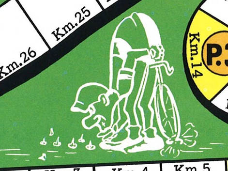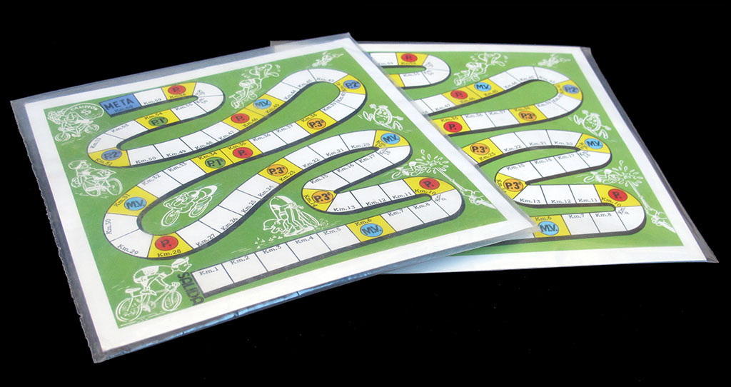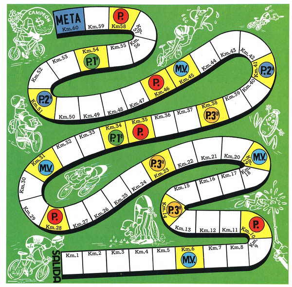 As could be expected, it is a simple roll'n'move game. The race incidents are either bad (puncture, go back 10 kms, that is, 10 squares) or good (intermediate sprints -"M.V". for "meta volante" in Spanish- and mountain passes where you advance 5, 3, 2 or 1 squares). The finish line has to be reached by an exact throw, but there is not goose-like reverse movement for overthrows.