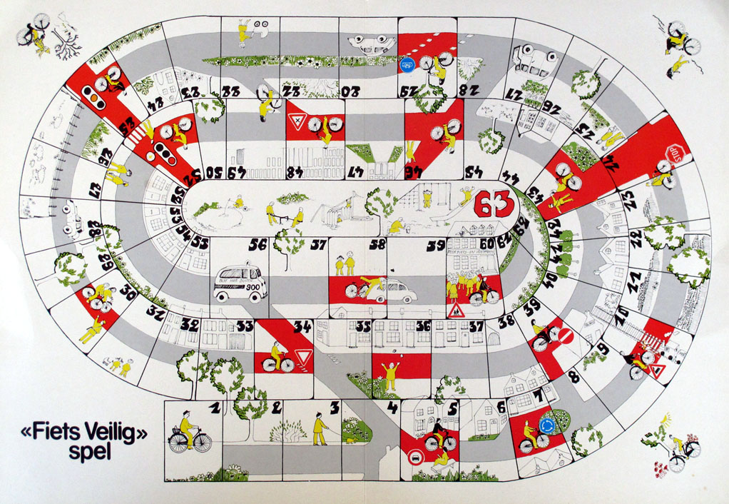 "Fiets veilig" translates as "safe cycling" and the whole point is to teach young children to behave on the road. The game rules (only Dutch) is just a set of simple instructions as "De agent duidt hier aan dat je mag oversteken, ga door naar nr 47" (the agent says that you may cross, go to field 47) and the like.