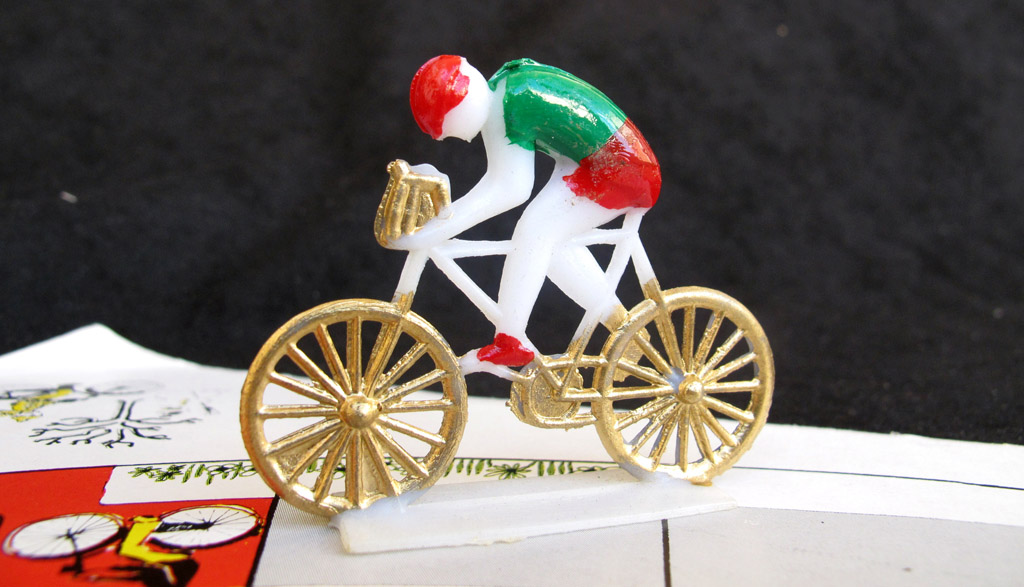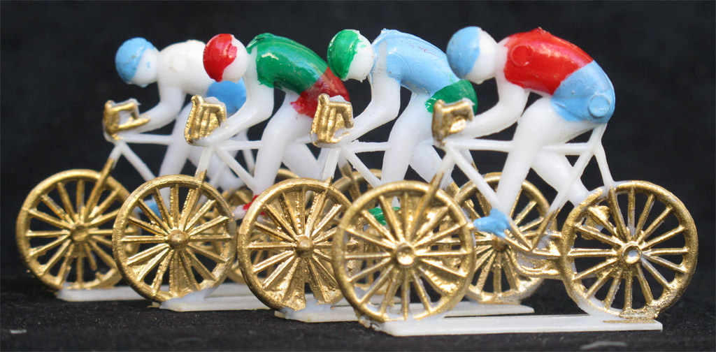 The best of the game by far is the set of four hard plastic, hand painted, riders that came with it. I had seen before similar riders in Belgium, though the ones I had seen did not have the wheels painted, if I remember well. I can't tell much about them, except that, obviously, they were not made specifically for this game.