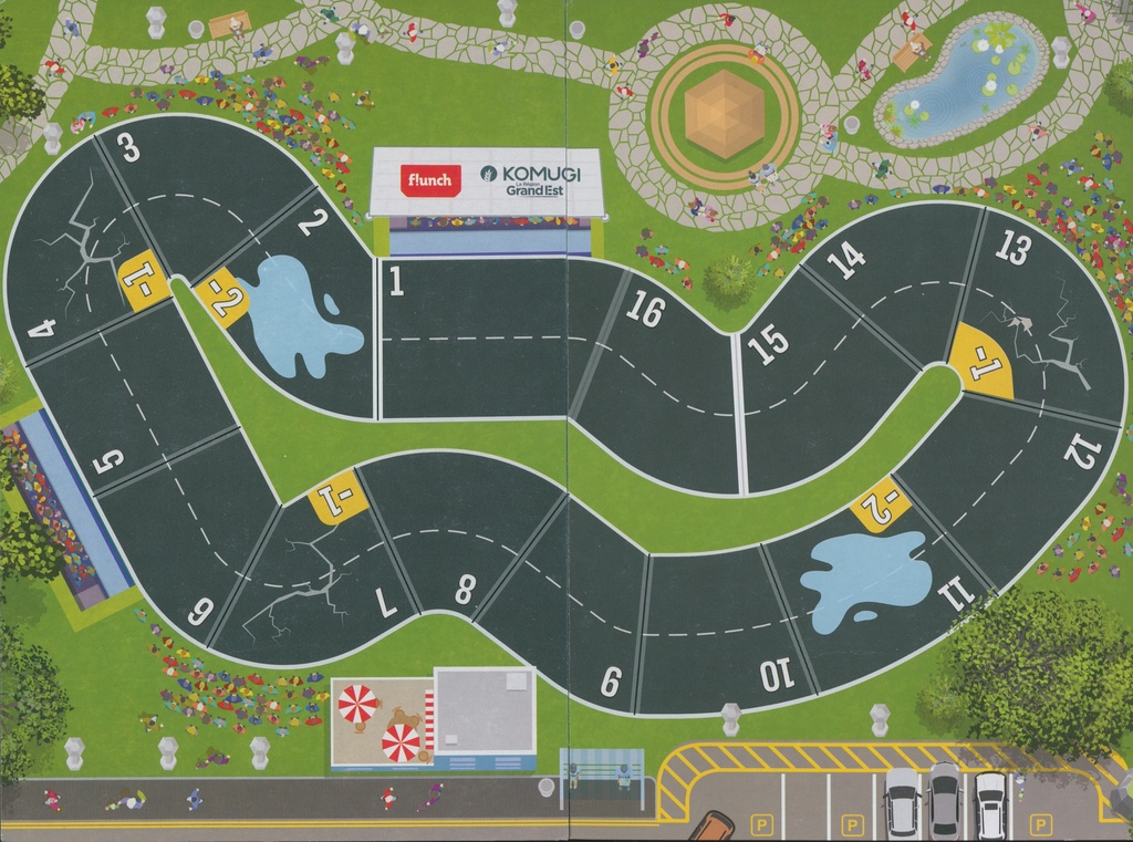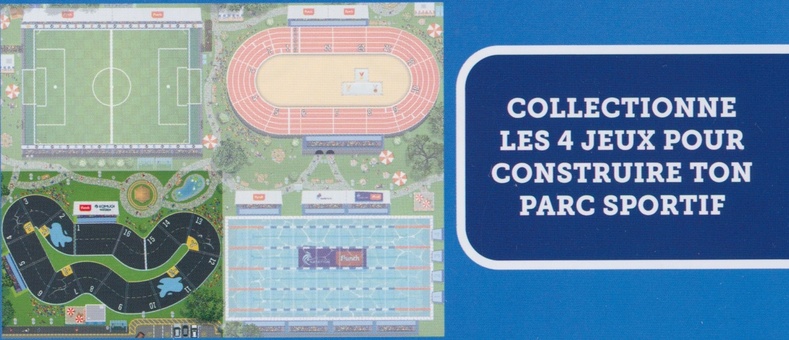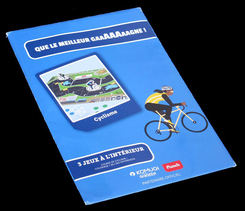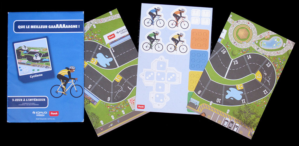 This is a small promotional game for a French chain of fast-food restaurants. It is part of a series of four sports games that, as far as I know, were given away to younger customers at some moment in 2024. Each game comes in a 21x15 cm envelope, and of course it is made of light cardboard and not meant to last. The envelope mentions three games inside, but only one of them can be considered a board game.