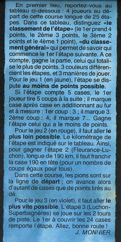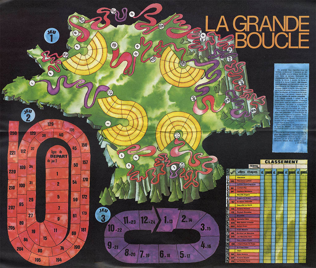 The magazine (as "Coeurs Vaillants") had already included a cycling game in 1950 and almost 30 years later they included this other game, as "Coeurs Vaillants - Formule1", on their issue n°26, june 27th to july 3rd, 1979. In this case the game is a 4-fold poster stapled to the magazine. It measures 54 x 46 cms and it features three different simple games for the different tour de France stages, indicated by the colours in the "Classement" table.