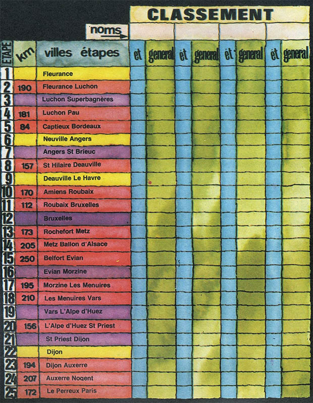 As mentioned above, the stages are those of the 1979 Tour de France. One could expect to have different colours for different types of "real" stages, I mean, one of the colours could be for flat stages, the other for hilly stages Or maybe for time-trials), and the third for the Alps and Pyrenées. But this is not so...