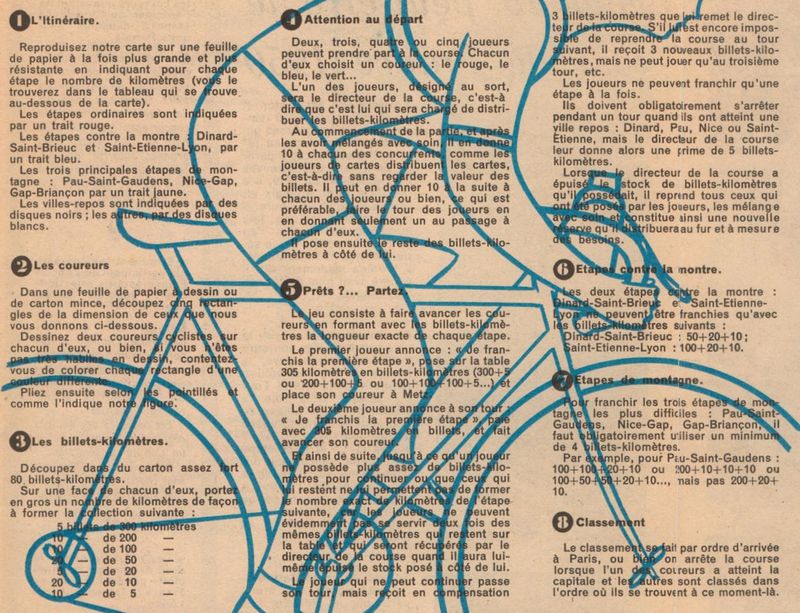 The game is a simple card game, inspired by "1000 Bornes". A stage-race-1000-bornes, if one can say so. Almost half of the rules are dedicated to the preparation of the game. As you can see, there are special rules for time-trial and mountain stages.