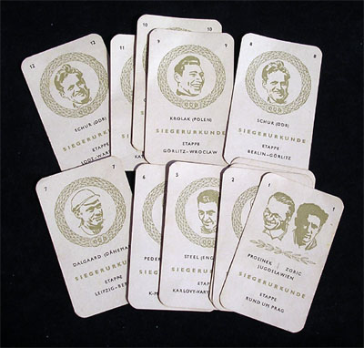 The game features twelve cards (not needed to play) with portraits of the winners of the first 12 editions of the race and the name of the 12 stages. First card features two riders since the first edition of the Freidensfahrt was split in two legs, so there were two winners.