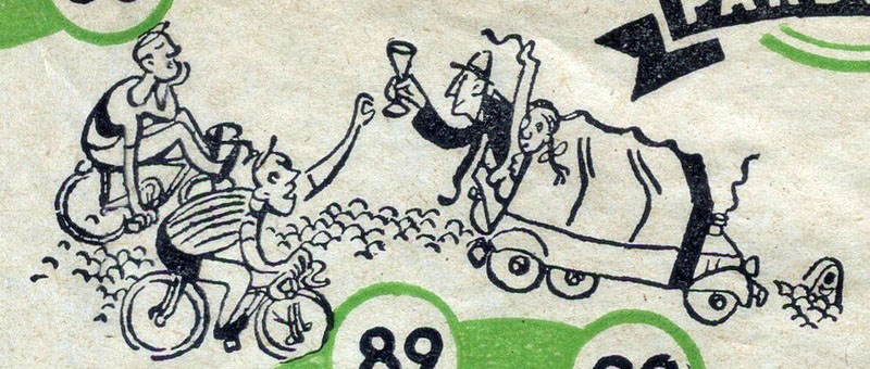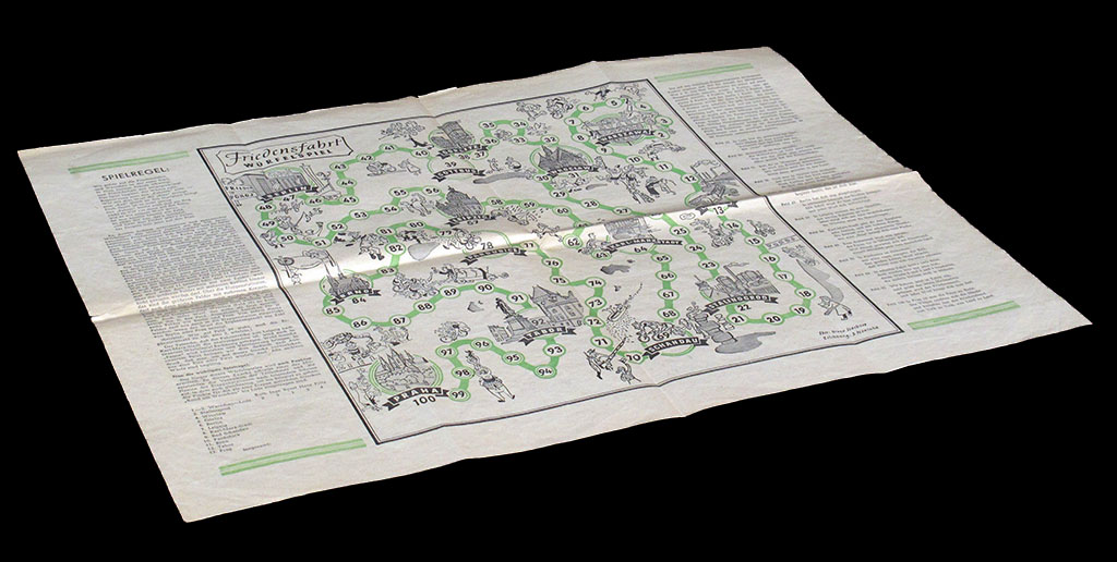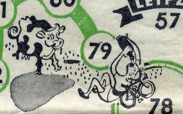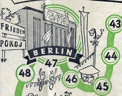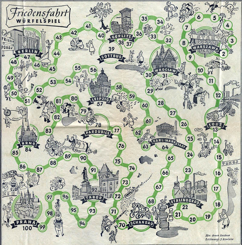 Here is a game issued for the 1954 Peace Race. It was probably issued with a newspaper or kids' magazine but, unlike this other quite similar game, there isn't any reference to the original magazine. Of course both games are chromatically similar, and at first I thought it was probably included in the Kinder-Wochenpost too. However, after having both games side by side, I am not so sure. They look less alike than in the pictures. The size is not the same and the green ink is of a different shade (or maybe it has just aged differently). Any further information will be welcome.
