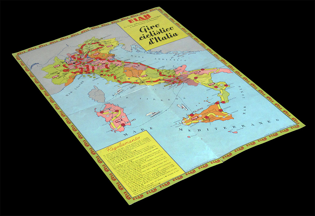The board is made of light cardboard and measures 58 x 42 cms. The main route (red route on the game board) follows the stages of the 1956 Giro d'Italia, but riders that fall on some spaces are force to take a longer (yellow) route, so that the game covers all Italy.
