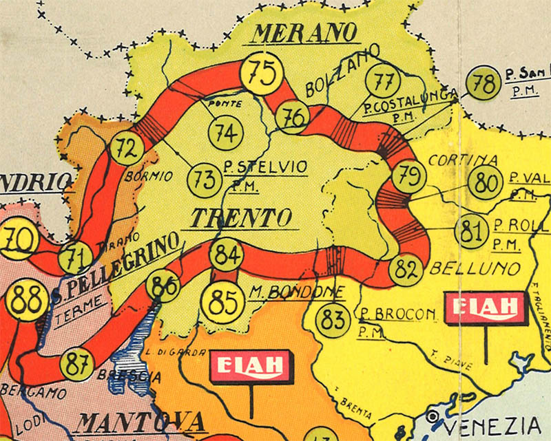 The game, of course, is a simple roll-and-move game, played with two dice. Players have to put one or more Elah candies in the common pot and the price is divided evenly between the winner of the Giro and the winner of the mountain classification. While the former is clearly determined by the rules (first rider to reach square 90 by an exact throw), the king-of-the-mountain rules are not so clear. The rule say that "whoever falls on square 73 (Stelvio) and 78 (San Pellegrino) and 85 (Monte Bondone) wins the Gran Premio della Montagna". What if no one falls on these squares, or not on all of them?