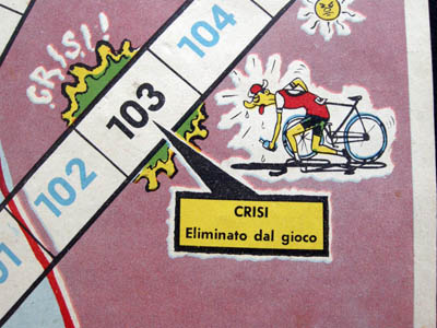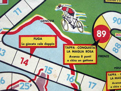 Judging from the information on the envelope, the game looks like a quite complete one, including sprints, time trials, prices for each stage, etc, but it is not. The time trial is that players who fall on th time trial square get an extra throw, or that the maglia rosa square just says "move forward 8 spaces and withdraw a counter". My favourite rule is "Forunculosis: Miss one turn" (square 68).