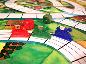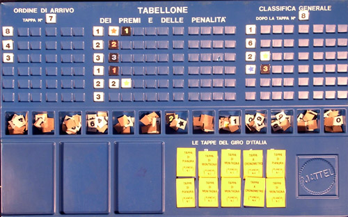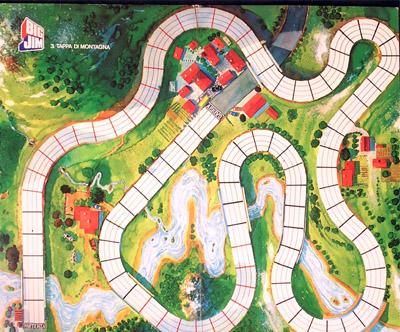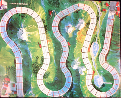 Big Jim is so strong he even takes part in the Giro! (This is how the rules of this game start). Leaving Big Jim aside, this is a nice game with two big two-sided boards, which makes 4 different tracks: 2 mountain stages, one time-trial (enĄding in a stadium) and a long flat stage (4th picture: notice the incredible design of that one: try to follow it!)