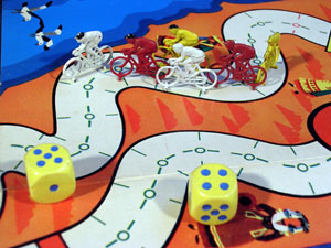 There are some tactic cards (won at red dotted squares) and misfortunes, a mountain rule (even numbers are divided by two, odd numbers are advanced fully) and even a simple aspiration rule (if the two riders in a team are one behind each other, you only throw one die, you add two to the die and move both riders accordingly, though you can't use that rule two consecutive turns).