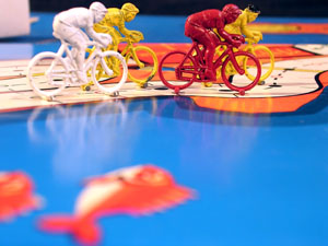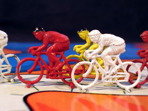 Double purposed Italian game. A cycling race and a car race can be played on the same board. Both games are quite simpleThe cycling game features three teams of two riders (whereas the car race features 6 independent cars) and the race consists of eight stages, including a time-trial. Points are awarded to the first three riders in each stage, but not all the stages award the same number of points. Flat stages award 3, 2 and 1 point, while harder mountain stages award 5, 4 and 3. The final stage awards 7, 6 and 5 points. Intermediate sprints also award points.