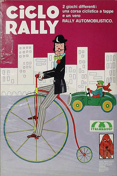 UPDATE July 2024: There is another version of this game, made by Italharvey. As far as I know, the contents of both boxes are almost identical, with the same board, the same metal riders (albeit in different colours), and the same metal cars. I wouldn't be able to tell which came first or why the Italharvey box has a vintage bicycle (and a vintage car) pictured on the box.