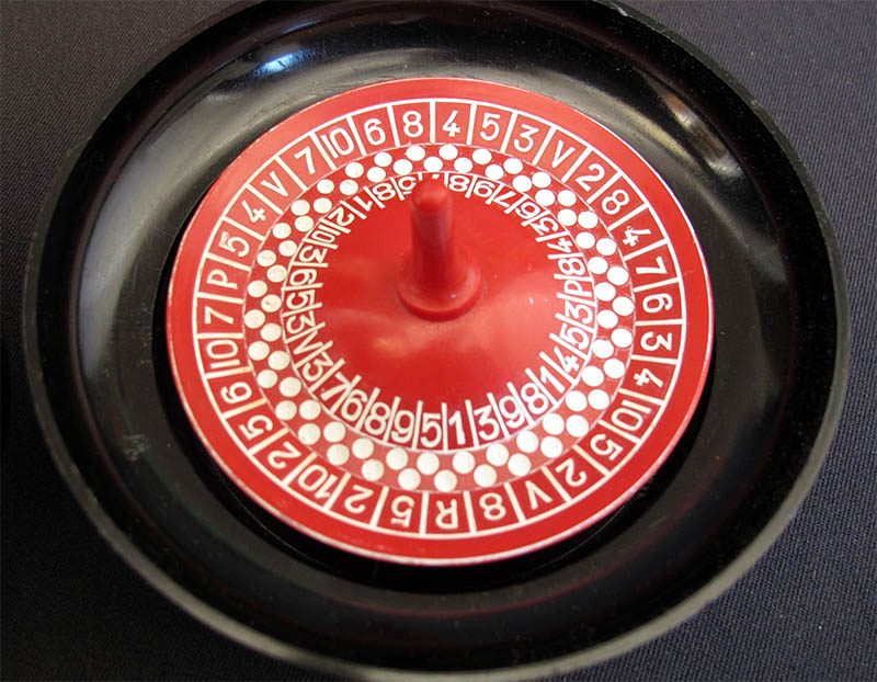 The most distinctive feature in this game is the roulette. Instead of dice, we have this contraption in which two or three balls are spun simultaneously. One of the balls is red, while the other are (or is) white. Unfortunately, I have two original white balls (one found in each game) but I do not have a red ball yet, so I did not include the balls in the picture.