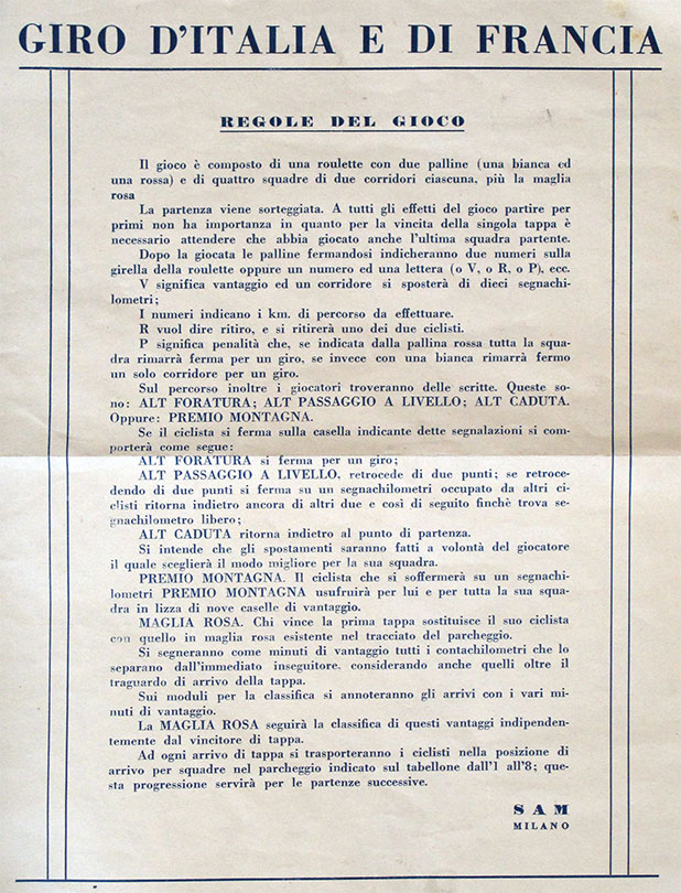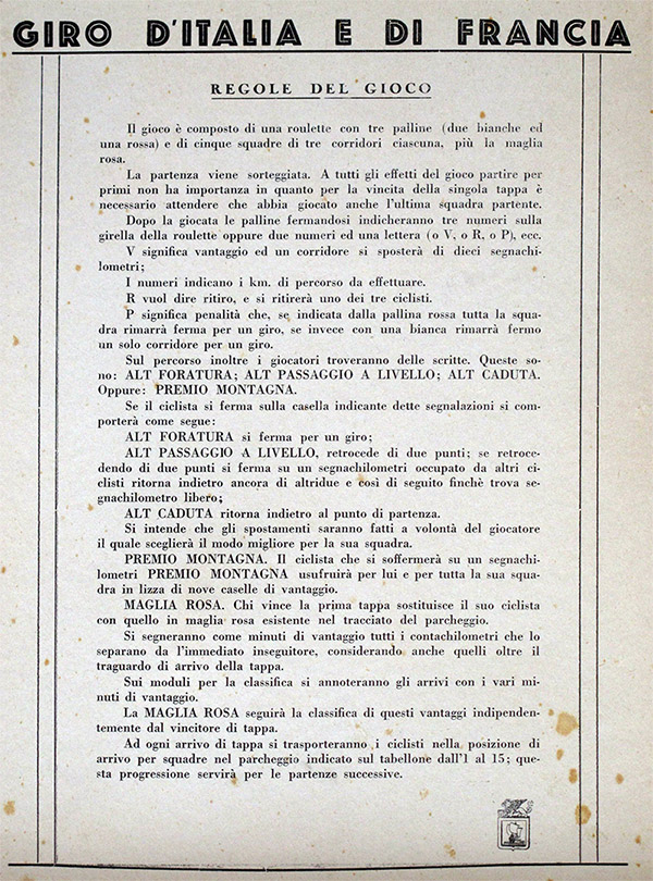 On the left, the rules glued to the bottom of the green box (therefore, found with the Tour Game). On the right, the rules found with the Giro game (as a separate sheet). It is interesting to notice that both rules refer to the maglia rosa (instead of the yellow jersey or "maglia gialla") .
