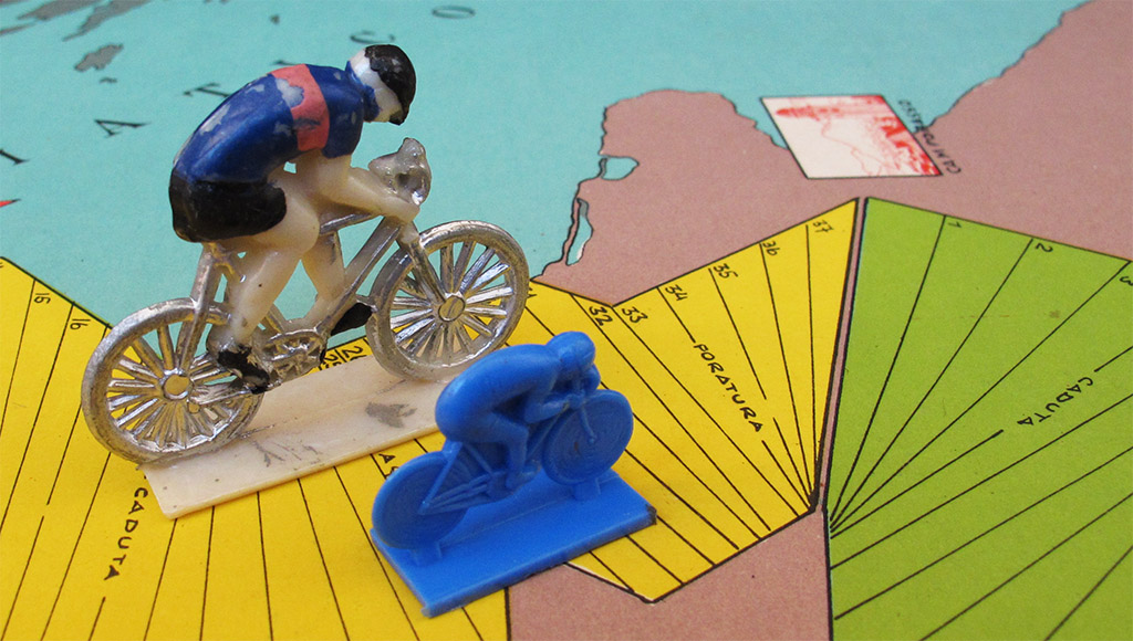Besides, the board includes the usual race incidents where riders miss a turn, go back some squares or even return to the beginning: foratura (puncture), passaggio a livello (level crossing) and caduta (fall). On the other hand there are some positive "premio de la montagna" (king of the mountains) squares in which the rider who falls on them and all his team (!) move 9 squares forward.