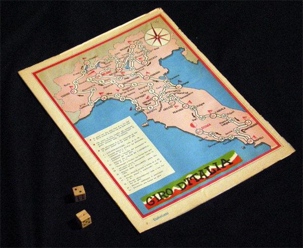 When I did not know the origin of this game I wrote, confidently: "[this game] is easy to date, since it follows the stages of the 1950 edition of the Giro". Well, surprise! Although it is true that the game follows the stages of the Giro d'Italia of 1950, this only proves that the game was made later than that. Of course a nine year delay is very unusual. Maybe the game was meant to be published some time before, or maybe it actually was, and this is is a reprint of a previous game, who knows.