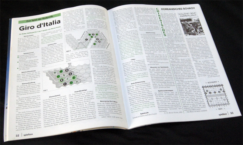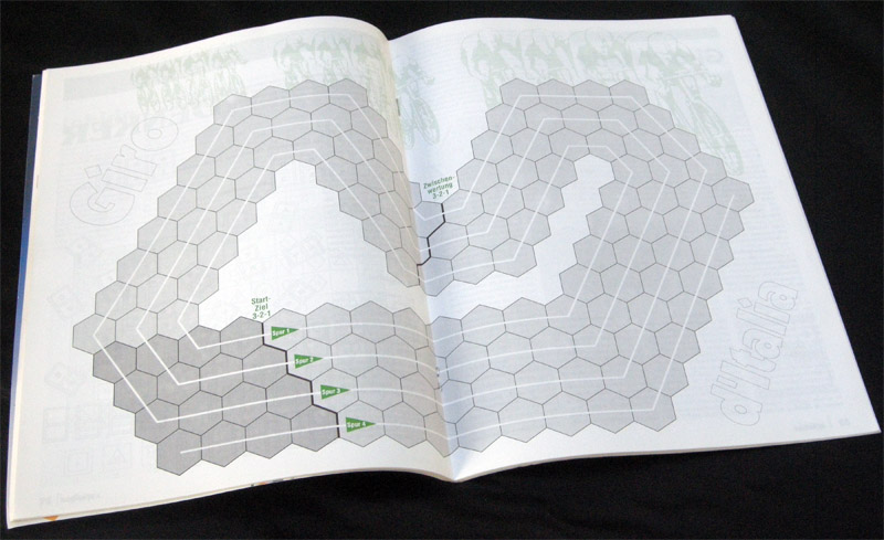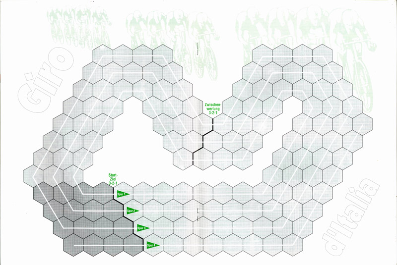 Cycling game by top game designer Dr. Knizia. It was included in june/july 1991 issue of the Spielbox magazine. It is a highly tactical game "of no chance" for 2 to 4 players who manage a team of four riders. The race consists of a one-lap race around a hexed circuit (though longer races are possible, as well as designing your own boards).