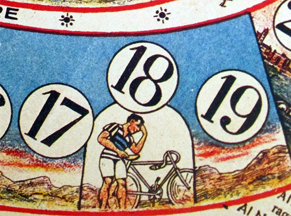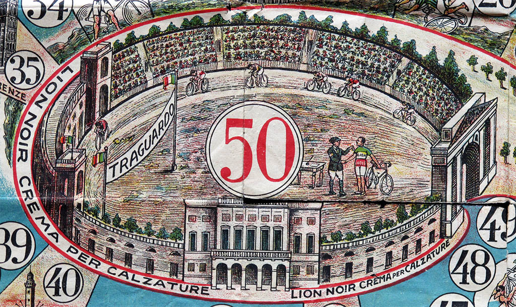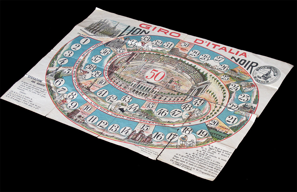 This is an Italian game from 1919, so far the oldest Italian game in my collection. Although it is a simple game of goose, it features the ten stages of the 1919 Giro d'Italia, which started and ended in Milano.
