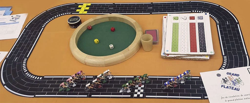 Grand Plateau is a game that tries to represent all aspects of a cycling race, either one-day or stage races. It has rules for uphill, downhill, and flat terrains, and different types of riders (the usual sprinter, rouleur, climber, and GC riders). The movement of the cyclists is controlled by dice, but the game has an energy-keeping system (also quite usual: moving less than the rolled number or placing your rider just behind another gives an energy token; spending these energy tokens -up to four per turn- allows you to advance extra squares). There are four different dice: a modified D6 for each type of terrain and a D20 for the (also usual) race incidents.