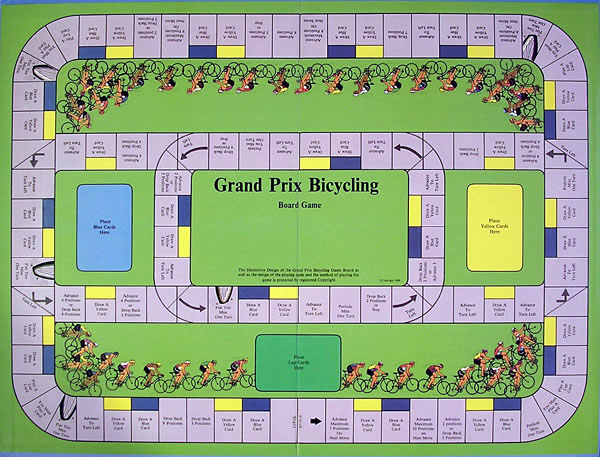 Blue cards are chance cards, yellow cards are booster cards (played instead of throwing the dice: any number of booster cards can be played at one time) while green cards are lap prices which can also be used as boosters. Very nice cards, by the way.