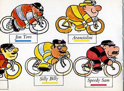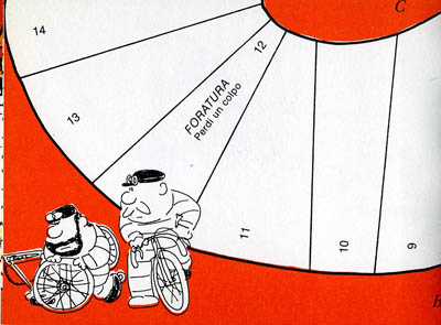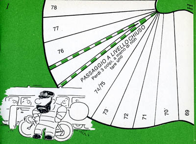Small italian cut up book. It just measure 16x12 cm. You are supposed to cut it (including the cover and back cover, where there are two riders. When everything is cut (no, I did not cut mine, I just scanned it), you will have 5 teams of 2 riders (plus an extra rider in case you lose one), and twelve two-sided track elements, with which you can play two different races.The green track is used for the individual race (one cyclist per team) over a course of 108 squares. It is played with a dice (a cut-up spinner is also included in case you don't have a die), and with a six on the die you get an extra throw. As is usual in this kind of games, some race incidents or advantages are incribed oin some squares. The only special rule is for the level crossing. When a rider arrives exactly on the square 74, the crossing is closed (you place the train accross the track) ans stays closed for three turns unless the player who is waiting throws a 1 on one of these turns.