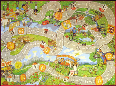 "Une course cycliste inspirée du jeu de l'oie", as the subtitle reads. Absolutely true. The board has 63 squares, the kilometer-mark squares double your throw, if you pass the square 63 you go back... There is even a laberinth and a prison (well square 58 is not Death but simply an accident. After all the game is intended for young children).