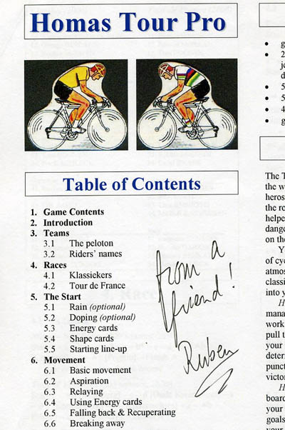 The most outstanding idea in these rules is the behaviour of the neutral teams. Neutral/virtual teams (not driven by any player) are in the back of the minds of many modern cycling game designrs (see the -unfinished- text New Directions In Cycling Board Games), and the neutral teams in HTP are the best so far. They are so good you can even play this game alone. (Stage races adapted for solo play are available for download).
