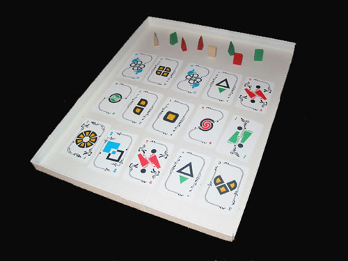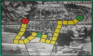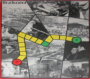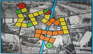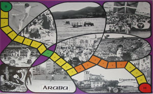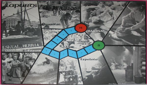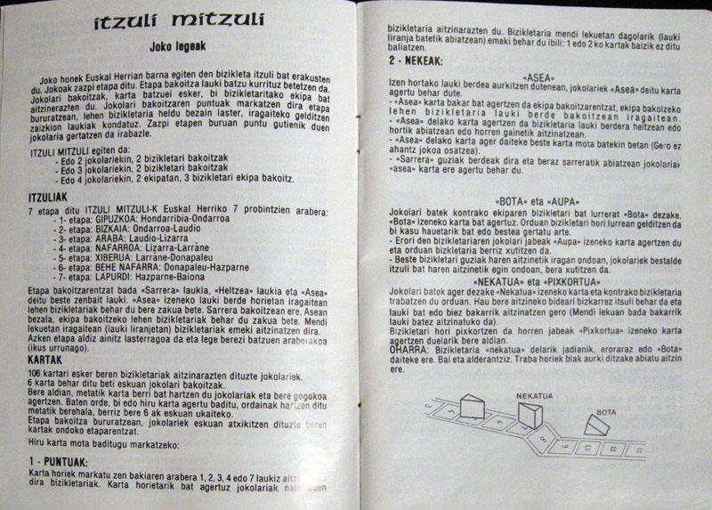 Beautiful rare game produced in the Basque country in the 1970s, with an important nationalist reivindication component. There are six boards representing the seven territories (Behe Nafarra and Xiberua share a board) reivindicated by Basque nationalism. The rules are in Euskara (Basque), Breton, Spanish, Catalan, French and another language I have not been able to identify, but is probably Corsican. The components of the game are quite geometrical: triangular wooden pegs represent the riders and the graphics on the cards are almost abstract. The rules, though, are disappointingly simple.