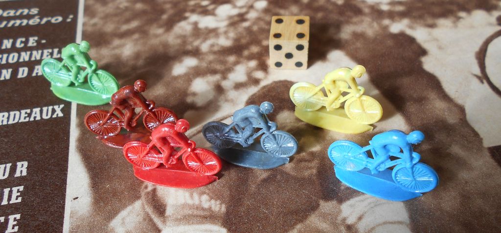 Thomas Visegrády from Budapest (thanks!) sends a picture of the complete set of cyclists plus the original wooden sharp-edged die. In case you wonder what is under the cyclists, he tells me it is a 1953 issue of Miroir-Sprint.