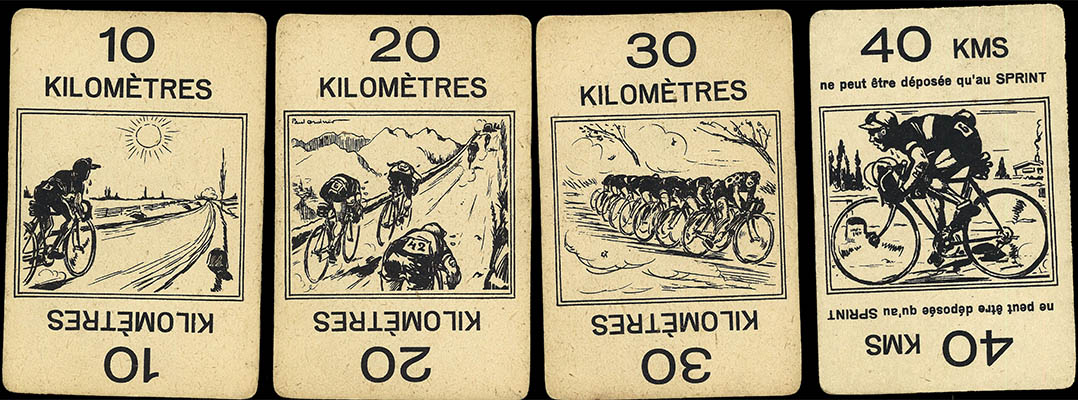 This is a hard-to-find Mille Bornes-type Tour de France themed card game. More specifically, it's rules are based on the game Touring, which is the game that actually inspired Mille Bornes. (The main difference between these games is that Mille Bornes included the "Coup Fourré" rule which was not present in Touring).